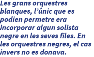 Durant els anys ’40, els petits grups que dirigia Benny Goodman (sextet, septet, etc.) varen anar incorporant progressivament solistes negres. En el cas de les grans orquestres blanques, l’únic que es podien permetre era incorporar algun solista negre en les seves files. Tal és el cas dels grans trompetistes Charlie Shavers i Hot Lips Page que varen actuar respectivament en les orquestres de Tommy Dorsey i Artie Shaw. En les orquestres negres el cas invers no es donava. Un exemple significatiu i esperpèntic d’això el trobem en la pel·lícula Check and Double Check (1930) en la qual apareix en una escena l’orquestra de Duke Ellington, i podem veure un dels seus trombonistes, el porto-riqueny Juan Tizol, blanc de pell, amb la cara embetumada.