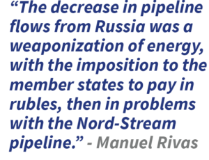 To open the second session, Manuel Rivas focused his presentation on explaining, through data, the magnitude of the global energy crisis and how it is impacting the European energy market. “These increases in prices are unprecedented, unprecedented to the point that some experts say it is comparable to the oil crisis of the 1970s,” he pointed out. Now, however, the epicenter is the gas, he added. According to this expert, “The decrease in pipeline flows from Russia was a weaponization of energy, with the imposition to the member states to pay in rubles, then in problems with the Nord-Stream pipeline.” Rivas also outlined one of the key factors that, according to him, have helped Europe stop the Russian energy coup: “We had to replace Russian gas – a very important part of our gas consumption – through policy and outreach to suppliers other than Russia, from Norway and the U.K.” US liquefied natural gas also played a key role. “LNG represented 15% of the European supply and now it’s 30%,” he calculated. “Without that we wouldn’t have been able to get through the crisis without shortages,” he stated. He also issued a warning. “Europe will need LNG for a long time, we must have the capacity to absorb it and inject it into our system,” he added. However, Rivas was hopeful. Since this winter has been mild, restocking this summer’s gas stocks for next winter shouldn’t be too difficult. “We are going to end this winter with stocks that will be close to 60%,” he quantified. Looking at the long term, Rivas explained that it is complicated to venture into making predictions, but he does predict the rapid reduction of gas consumption and its replacement by energies such as wind and solar. “Probably after 2025, there will be significant amounts of biomethane and hydrogen produced from renewable sources,” he concluded.