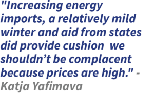 In the first presentation, Katja Yafimava outlined the outbreak of the energy crisis, from the second half of 2021 to the present day. “The crisis was a perfect storm of all different factors coming into play at the same time” that have caused European energy supply and demand to be out of sync, she summed up just after taking the floor. According to this expert, the main cause has been the sudden reduction in gas from Russia, which arrived to Europe through four major corridors. This includes Belarus, which is still working; the Nord-Stream, which stopped working due to sabotage; the Turkish one, which supplies southern Europe, and the Ukrainian one, which continues to operate, but is located in a zone of armed conflict. Europe “compensated for the loss of supplies by increasing sharply energy from all over the globe, mostly from the United States and Qatar,” she clarified. However, the energy crisis has also been alleviated thanks to other factors. We had a “relatively mild winter, which meant that demand fell quite sharply,” she offered as an example. For Yafimava, this has been a key element. “Although Europe has been successful in averting the worst, so the impact wasn’t as bad as one might have expected, we shouldn’t be complacent because Europe now faces the challenge of refilling its storages ahead of next winter,” she highlighted. In this sense, the panelist emphasized the European efforts to aid its people and the production framework to cope with the increase in energy prices. “Europe emerged relatively unharmed but prices are pretty high. European governments did provide cushion, but we should not underestimate,” she predicted. “There could be quite difficult challenging times ahead.”