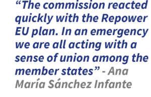 Next up was Ana María Sánchez Infante, policy officer of the European Commission’s Energy Platform Task Force. In her presentation, the expert from the European Commission reviewed the measures taken by the European Union to deal with the energy shortage situation. At the outbreak of the conflict “the commission came up with a quick reaction with the preannouncement of the Repower EU plan, which we officially published on the 18th of May, in record time” she contextualized. According to this expert, this fact corroborates that, “in an emergency we are all acting and reacting with a sense of union among the member states”. Broadly speaking, the plan seeks to end the EU’s energy dependence on Russian fossil fuels and accelerate the transition to clean energy. “We want to reduce dependency on Russian fossil fuels in a very quick manner; acceleration of the implementation of renewable energies; increasing energy efficiency and diversifying our energy suppliers”, she specified. The speaker also recalled the efforts made by the European Union to reduce the gas demand of the member states, which was achieved, as well as the streamlining of the procedures to speed up the granting of permits to create new plants generating clean energy. “We came through with a lot of sacrifices from all of us, but this is not over yet because now our main concern is the preparation for this winter,” she concluded.