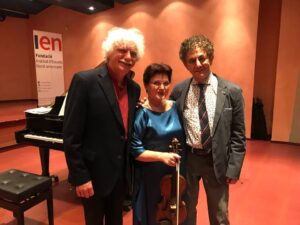 Picture of compositor Ilya Levinson with concert performers Ala and Guerassim Voronkov.