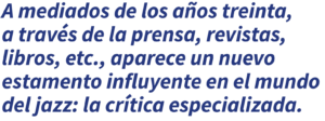 A mediados de los años treinta, a través de la prensa, revistas, libros, etc., aparece un nuevo estamento influyente en el mundo del jazz: la crítica especializada, integrada mayoritariamente por críticos blancos de formación clásica, con sus criterios y prejuicios. Paralelamente, muchos músicos se forman en conservatorios como la Juilliard School de Nueva York. Estos dos elementos: la crítica musical, con poder e influencia, y el entorno profesional surgido de la academia, poseedor de las sublimidades musicales, aparecen como los nuevos receptores y jueces de lo que sucede en el mundo del jazz. Es a partir de aquí cuando cambia la actitud de muchos músicos, especialmente de los jóvenes que emergen en este nuevo entorno. El músico toca y actúa pensando en lo que dirán de él los críticos (capacidad innovadora, superación de lo que se ha hecho hasta entonces, etc.), y también en estar a la altura de sus colegas; todo ello revestido de una actitud “seria”, “digna” y “trascendental”. Estas son las dos actitudes con las que se encuentra actualmente el aficionado al jazz.